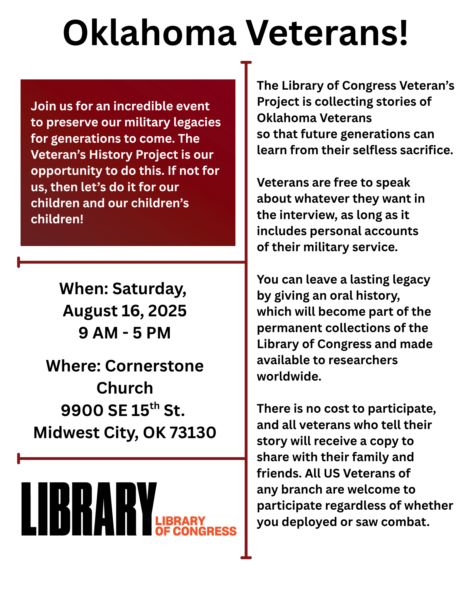 Join us for an incredible event to preserve our military legacies for generations to come. The Veteran's History Project is our opportunity to do this. If not for us, then let's do it for our children and our children's children!